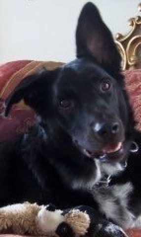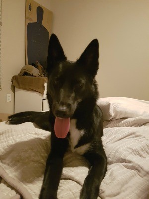 Hes a black German Shepard and Villarreal collie mix. Ver smart dogs :)