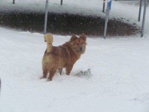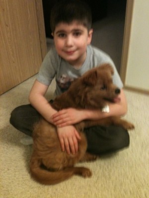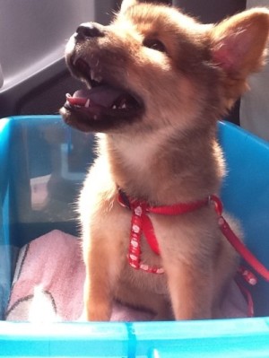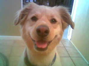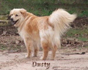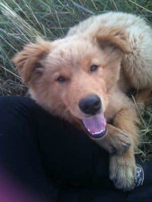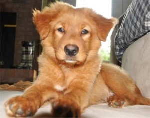 We adopted a golden/chow puppy from the animal shelter a little over a month ago. He had been live trapped and the center labeled him as feral as he was extremely shy, would bite and not look people in the eye. Within a month the puppy has become the brightest and best pup ever. He is smart, potty trained, loves to be petted and active like any puppy. We named him Double Dew because one of his back legs has a double dew claw on it! Here is his photo. We just love him!