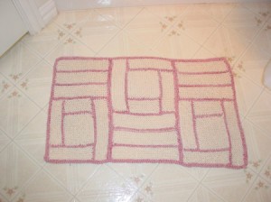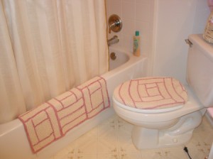 I unraveled a half-finished sweater and used that off-white yarn and some leftover pink and ribbon yarn to make a toilet seat cover and bathmat for my guest bath. I used a log cabin pattern from the Mason-Dixon Knitting book.