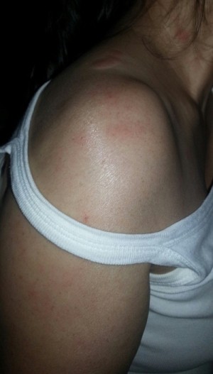 I have tried everything! Running my A/C low may help but what about when I walk outside? I'm the only one, the only person that gets bit by these! Even the maintenance man laughs at me! He says you are the only one getting bit around here. What else can I do? I can't move again! I'm feeling trapped in my home and I don't like inhaling all these bug spray inside my house. I'm gonna go crazy! Here's some of my photo from last night. These pics are just from coming out of my car to upstairs. Imagine if I were to sit outside for 5 mins?