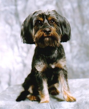 Looks like a Yorkie, but it's so hard to tell. I once had a dog that looked like a small black lab, and I know for a fact that her mother was a white poodle!
