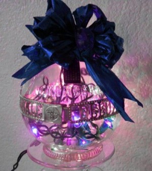 Every Christmas I fill a gallon glass jar with Christmas balls, tinsel and a string of tiny Christmas lights. Then I stuff some green wrapping paper in the top and plug in the lights.