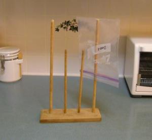 I reuse my bags as well unless raw meat was stored in them. I wash with hot sudsy water, rinse with hot water and then hang to dry. I love the rack that Betty's husband made. What I usually do it to put upside down over a tall drinking glass or simular. Sometimes I use a magnet and hang off the fridge. Then I throw them away when worn out.