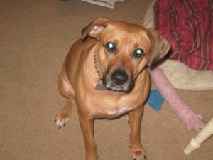 You have a Rodesian Ridgeback Boxer a great dog and quite intellegent dog as well as a very loyal dog that will protect you and your family they can be stubborn but treats will go a long way for you to properly train the dog.