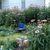 Front Yard PerennialsWe removed the turf from the postage stamps size areas of our lawn next to the house, and put in lots of stone and ground covers.  Over the last few years, we have added many perennials along the odd wind chime and bubbler fountain.
