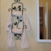 Reuse Plate Holder for TowelsI wanted something different in my bathroom to hang my decorator towels on and I had an unused plate holder in the closet. It's very decorative in itself up with the towels draped over it in the bathroom, it's a new look. I didn't use it for plates anymore so it's getting a second use!