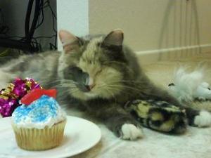Blind from neglect - eyes removed at age 2 months. Currently is donating items to Escondido Cal Humane Society in his annual charity fundraiser. Previously Humane Society Cat of the year in KC ( 2000 ).