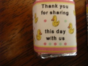Get a duck dish for the mints and place at the sign in table with a yellow table cloth. Remember fabric makes everything soft. Have the guest of honor sit in a rocking chair with yellow fabric tied around the top and a bow on the back or even better if she can use in the home or nursery get a cushion or back made out of duck fabric.