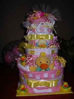 I only spent about 25 dollars on the "ingredients" for my cake, and everyone loved it. Don't try to buy one premade over the internet, they are so expensive. A little time consuming to make, but the "wow" factor is so worth it, plus everything can be used by the new mom.