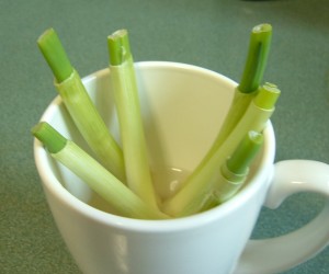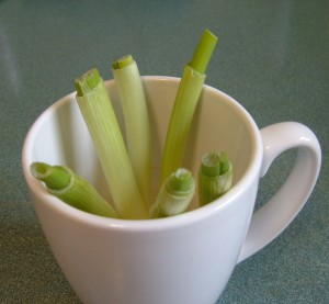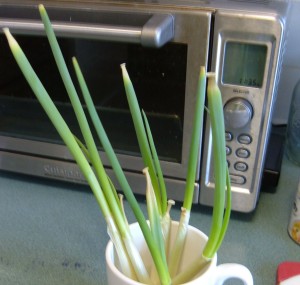 I learned this trick from our daughter. When I make cabbage soup, I put the bulb end of the green onions in water and grow my own. They are ready to cut in about 6 days.