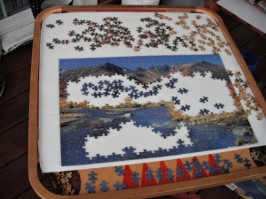 The Carrom board was easy to move from the table and out of the way without disturbing the puzzle. After dinner, we put it back on the table and finished putting the puzzle together.