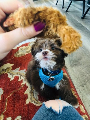 What a cutie!!! What is his name? Is he a teddybear dog (bishon/Shih Tzu)? He looks like our nephew dog!!