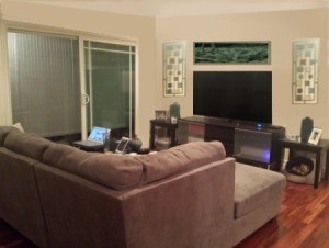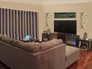 My last suggestion. The lines on your television wall are all broken. They are hard on the eye and make the room look smaller. May I suggest all your wall hangings are at the same height as the top of your glass doors, creating one clean line. The lamps and shades are out of place. I suggest they be replaced with olive figurines or such. (Don't judge by my hastily inserted objects). The center wall hanging should be long and narrow, If possible, the same width or less than the TV screen. Do keep the overhead lamp dimmed to a minimum. The harsh reflected light will also make the room look smaller.