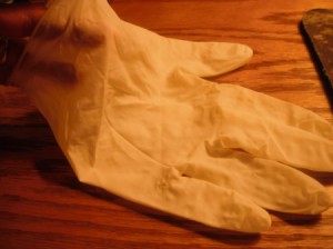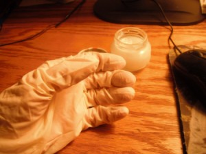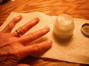 My hands have taken a beating the last couple of days with me working outside in the yard. When they get like this, I put the coconut oil on my hands and then put this pair of disposable gloves on. The coconut oil really does soften up my hands and cuticles around my fingernails. I can actually still work on the computer with the gloves on.