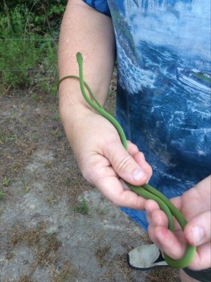 We were walking today and she reaches out and grabs this fellow off of a pine tree limb. It's a beautiful rough green snake and has pretty eyes.