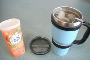 For a treat, I like 3/4 water, 1/4 Crystal Light Peach- Mango green tea and a cube of frozen lemon juice in my 20 ounce mug. A half gallon of Crystal light tea will last me 2-3 days.