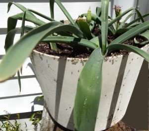 A minute after giving her water, I noticed ants crawling from the base of the pot. I was sure they had set up housekeeping and that there were hundreds in the pot. I was right. I took Miss Agla outside and sat her in a shop vacuum cleaner tank. I filled the tank with water.