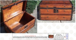 I think this is a Civil War era trunk (circa 1870). Due to the need for metal and leather in that period, little tin was used in the manufacture of trunks, the surface was originally covered with paper. Many of these trunks were banded with metal.