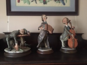 I have 3 Giuseppe Armani figurines. They all have characters like the one in the photo, older men. This one with the cello, one standing with an accordion, and one of a drunk older man slumped on a table. I found the name for the last one, it is "One too many". I would like to know how to find the names for the other two and what series this belongs to. Are there any collectors groups for this series? I know there are groups for G. Armani, but I want to know if there is anything specific for this series. What "finish" is this? Any information would be helpful. I would also like to find out how much they are worth.