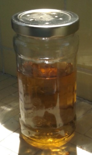 A friend taught me this one, several years ago. I made a little one out of a straight-sided pill bottle (of which I had plenty around!) so I could empty it often without wasting a lot of vinegar, but I never thought of using plastic wrap to cover it! I just propped it up at an angle so the flies could get in it easily, but it was hard to prop it securely. So the cover is an ingenious addition! Btw, I used apple cider vinegar in mine.