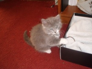 Fuzzy Wuzzy is a 10 month old domestic longhair. Fuzzy's mom showed up at my door, very pregnant, last year on Labor Day. She gave birth to 5 kittens (including Fuzzy) and I found good homes for 4 of them and kept both Fuzzy and her mom- Little Orphan Annie.