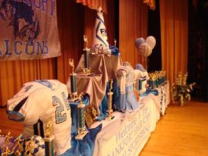 The volleyball banquet that I hosted was in November - I went with a fall theme. I decorated the tables with burlap, white table clothes. Center pieces were white candes in glass holders. I sprinkled fall leaves as confetti on the tables. I had hay as my main display decorated with pumkins & white lights. The hightlight was a chocolate fountain...everyone went crazy!!!! Everything looked very elegant. Even the coach's were very impressed!! Also, as a gift to the coach the team pitched in to purchase a v-ball with the team picture on it and each girl signed the ball! It sure was a success!!