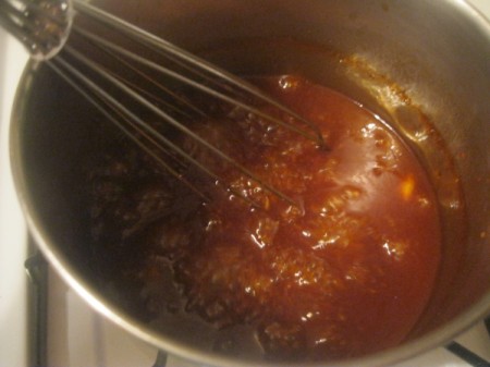 - While chicken is baking, make sauce.  In saucepan, combine honey, brown sugar, garlic, ketchup, chipotles, cider vinegar, water, and a pinch of salt and pepper.  Bring to a boil.  Once boiling, make a slurry by mixing the tablespoon of water with cornstarch.  Add to sauce.  Whisk til thickened, about 3-4 minutes.