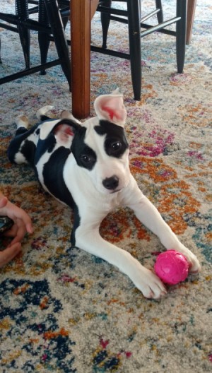 Depending on the way her head and body shapes as she gets older will help you determine whether or not she has pit in her. My pit/lab looked just like a pit until he was about 8 months then you could see the lab in him because of his longer legs. (01/12/2008)