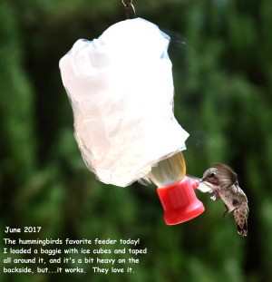 Photo Description So now each summer, I have a plastic container that I'd cut a hole out of the bottom so their smallest feeder will slide into it, and then I ice the surrounding area inside of the container. Now they have chilled nectar :) I put a small amount of foil in the bottom of the container because the hole in the bottom I'd cut out was a bit too large, and that helps support the ice from falling out. With this particular feeder the juice stays nice and chilled for the hummingbirds. Initially I didn't know if they'd even like (nectar on ice) in this summer heat, but they DO! :) They go nuts over this one feeder, all of the other feeders are within a couple of feet of each other so I was able to see if they kept going back to it or not, and they do prefer their juice chilled. The ice cubes actually last about 3-4 hrs in full sun too! When it melts, I just put more ice cubes in the container. Little Tuxie, we call him, is in the third and fourth picture, he's the one with the purple "bow tie" as we say. He's the Black Chinned Hummingbird that flies to south America each year at the end of September and returns about 6 months later. I can see in the picture when it's enlarged, he's got some tiny white spots on his little black feathered face, which tells me he's been fighting and lost a few tiny black feathers or he's getting a few greys, hehehe. The first picture is a young/juvenile male Ruby Throat Hummingbird, I think/he appears to be. The last pic, this little sweetness is new to the pack here, we call her Freckles, and we know she's happy like the others because she's been here daily now for over a week and she too loves the "nectar on ice".