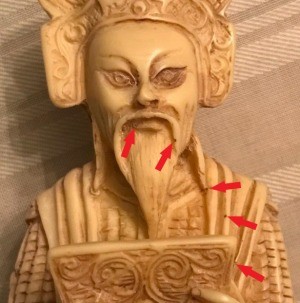 Examine the surface under a magnifying lens: authentic ivory will have the pattern of intersecting arcs ("engine turning" / Schreger lines); bone will have porous cavity, small pits and short longitudinal striations manual.museum.wa.gov.au/
