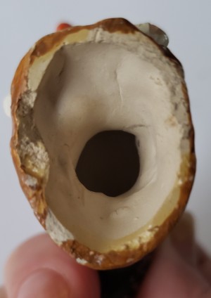 Unfortunately there is not even a ghost of a sticker or marking on this chicken piece, and that's awesome that you mentioned the eyes, because I did note how primitive they are as well...and it kind of stood out to me because it looks like the painter put at least a LITTLE effort into making the feathers somewhat more detailed...and then phoned it in on pretty much everything else!