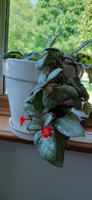 I posted a picture of this plant yesterday, but it turned out very dark so I am posting it again today with a new picture. I am wondering what the name of this plant is. It has fuzzy leaves and stem and has tiny red flowers when it flowers. The 2nd pic shows 2 tiny buds and once it flowers the blooms only last for a day or two.
