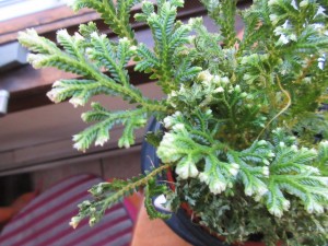 It is the selaginellae family and this member is the Selaginella martensii Frosty (sometimes sold under the name of Selaginella kraussiana Frosty' but it is a mistake) . It needs constant humidity and the white parts of the plant turns green when temperature is too hot, the frosty parts comes back in the winter with lower temperature that is why it is often sold for Christmas decoration.
