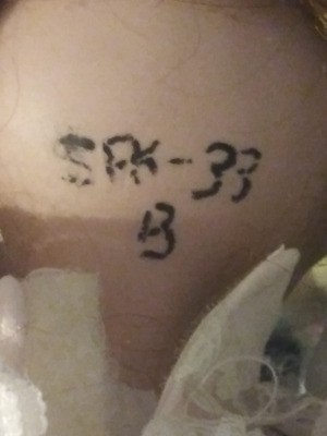 I have a porcelain doll with neck markings Sfk-33 with a ""B under that. Can any one tell me any info such as age, manufacturer, and value? She stands about 2 feet high. The hands and feet are porcelain. She has red hair, snap on shoes, underwear, a dress, and strand pearl necklace.