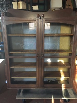 So what I think you have (based on the shelves inside with grooves in them) the top half of a china closet. The bottom of the piece should have holes where it was screwed on to the base or places where legs were affixed.