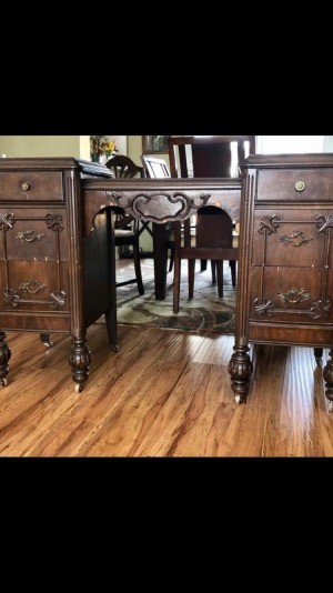 I guesstimate the 50's . My grandmother had this similar piece. You could take your photos and show to a antique/furniture dealer for more info about your pieces.