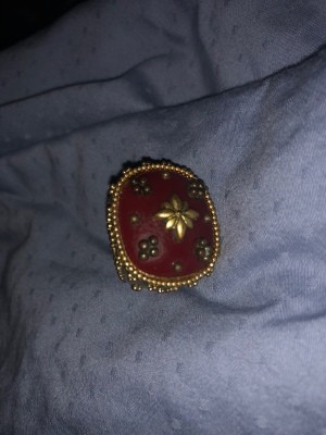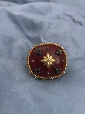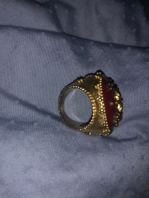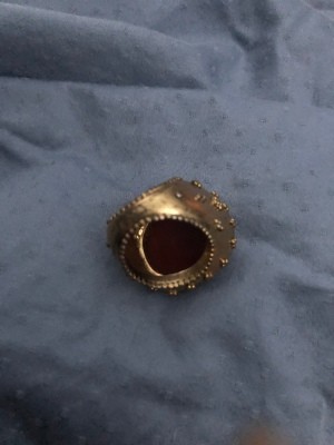 Hello! Thank you for the detailed reply! I did test to see if the piece was magnetic and its not so it *may* be gold. I thought it might be enamel or perhaps even red carnelian, though I cant really tell. It seems more likely to be enamel. The ring part is light but the stone itself is heavy which is why I thought it was maybe a stone. It also dings when you tap the stone. I will look for a AN dealer.