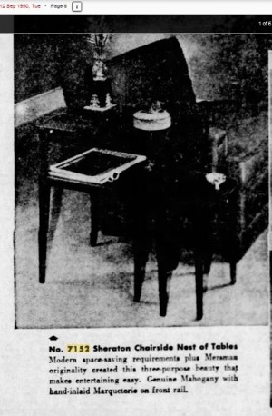 But, so far, all references point to this 1950 model. The photos in the old papers are two dark for me to verify it is the same table but it does state they are mahogany with the marque pattern on the front like yours has (apparently hand laid patterns) so that sounds like 2 of 3 things match--it is just the shelf is what is throwing me off.