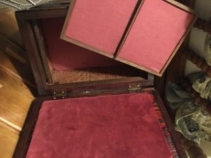 I purchased this little table today at Goodwill. It appears to be antique. The inside has a velvet lining. The top lifts up and there is storage under it. Only the bottom drawer in the front is an actual drawer although it looks like there are two drawers.