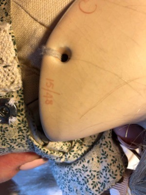 theses are the markings at the back of the doll. She was made in 1932. Other than the broken leg she is in fine condition.