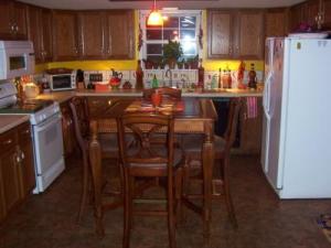 A couple of years ago we embarked upon installing the fan hood in our small kitchen with sloped ceiling, the entire upper cabinet had to be removed to install a beam. Not much money to do alot so we recycled and planed down the boards of cabinet. Settled for the used, rustic look. Painted the back walls turquoise blue and installed yellow pine open cabinet shelves in the step step pattern to flow along the sloped ceiling. The blue back drop with the yellow pine worked nicely. Recently got new appliance, black fridge and black and stainless stove. The black fridge stood out quite vivid. I played it down with red striped guatemalan blanket draped across the top and side with a terra cotta pitcher with sunflowers, basket, and gourd. I put a mexican art work on the upper door of fridge. Decorate with bright hues of red blue yellow, orange. Sites will tell you that bubble gum pink and lime is also festive but I am not into that. Splashes of bold colors are what makes it festive. I plan to put christmas light along the ceiling for extra lighting.