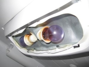 So, about two months later (September, 2012?) the clip on the right door breaks off and now the door does not shut completely unless you "double" shut it. I came home one day and the door to the fridge was slightly ajar (1/4 inch or so) and all the food was room temperature. Freezer was still cold though, so I figured one of my teenagers had not followed my instructions to remember to "double shut" the door until we could get around to fixing it. A day or two later, the same thing happened, only this time, I noticed a "burned" smell. I could see no problem but called a repair service out to make sure we did not have some kind of electrical short in the thing. The next day, before the repairman even came out, I opened the fridge and the plastic light housing clattered to the floor! The burned smell was very strong and the thing had clearly melted! I tried to remove the light bulbs with my fingers but they were just too hot and I had to use my silicone oven mitts to get them out. Without the bulbs in, and reminding my family to double check to make sure the door was fully closed, the fridge seemed to operate fine and kept the food cold. Since the problem no longer seemed urgent and I had just started a new job, I figured the repair could wait until I felt I could take a day off to wait for the repairman and deal with it. Of course, my husband has complained a lot about feeling like Helen Keller every time he opens the thing and has to poke around "in the dark", but otherwise, the fridge was working well enough that it was not so urgent. Life was very hectic for a few months and I did not actually get around to finally calling for the repair people until just last week (end of December 2012).