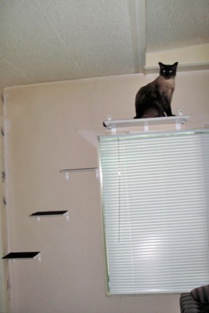 Your chocolate couch will go with any color, so pick your favorite color. As a sample, mine is orchid, so we started with that color and cut the shade in half (at the store) and it turned out to be very pale orchid, not a shock to the system. In another room, we have another favorite color, aqua - did the same thing and all of it is very livable. We haven't changed the colors and still love them for 14 years. It's getting time to repaint and we are going for the same colors again. So, seriously consider what are the favorite colors in your family. The wall area closest to the kitty steps is the actual color I was discussing, we have black furniture.