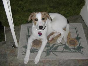 Cookie is a Jack Russell Terrier, approx 10 mos.old and 11 pounds of fun. She is very calm, loveable she does get wild but that is only outside. She does chase our spoiled cat Scottie around and Scottie is not sure about that but loves Cookie. They wrestle, fight to be first in daddy's lap and then nap cuddled up.