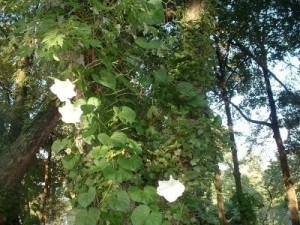 Photo Description Heady, muddled, sweet, stankin', whatever my neighbors might think of the scent, they're going to get a hefty whiff of the stuff every evening from a couple weeks from now, til frost. People, I have planted moonflower vines everywhere. Maybe I overdid it? Anyway, in a few weeks, I should have fifty to a hundred moonflower vine blooms open at one time on any given evening. I plan to post pictures when the display is at it's peak. The pictures will probably be taken just after sunrise, as the blooms close early morning.