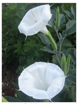 On the other hand, Ipomoea alba, the Moonflower Vine also commonly called Angel Trumpet, Devil's Trumpet, etc. does open late evening. It's perfume is so pleasant, it is often planted by doorways. It is in fact related to the sweet potato and morning glory. The young leaves and the seed are eaten and prepared in several ways.