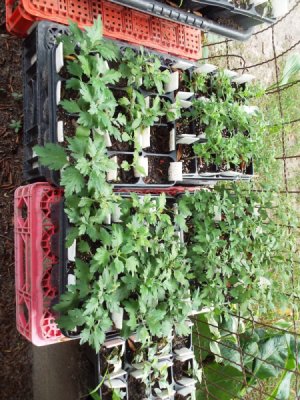 And here are some of the mum cuttings (The garden variety that you can't overwinter, only I did). They grew too large for the little congested pot they were in. I planted them in individual cell packs. I hope they don't out grow the cell packs before I need them in flower beds this Fall.