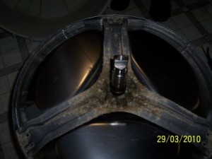 The picture below shows a spider removed from a Frigidaire built machine after 18 months service. Note the start of the build up of crud and the white spots, which are the products of corrosion. Liquid Tide was the only laundry aid used in this machine. The spider was removed because of bearing and seal failure: some of the crud is debris from this failure but it does demonstrate how contaminants are not easily removed from this area.
