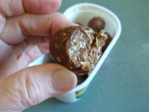 After mixing the peanut butter and honey, I heated it in the microwave for about 30 seconds and then added the chocolate chips. The melted chocolate blended in with all the other ingredients and they turned out really good. They are also good frozen.