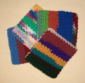Chaining what I wanted for width, I made a single crochet in the first chain, chained 1, and skipped 1 chain and made another single crochet in the next chain across. Turn and chain 1 repeating this pattern for the entire project. I love variegated yarn so I stayed with that throughout.